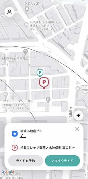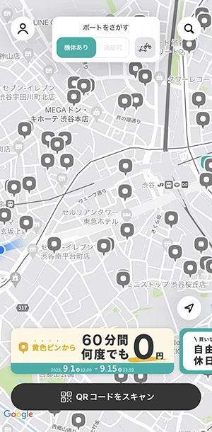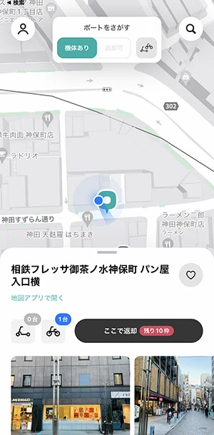 - アプリで、使いたいポートの場所と車体、返却空きの有無をチェックする。キックボードか自転車かの種類は、「ポートをさがす」のアイコンをタップして絞り込める。バッテリー残量も要チェック。予約ができるのは10分前。