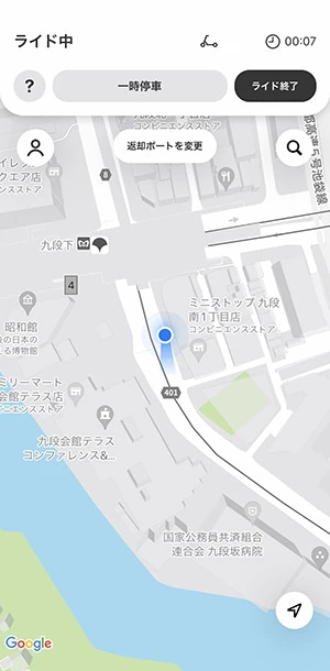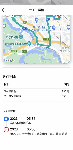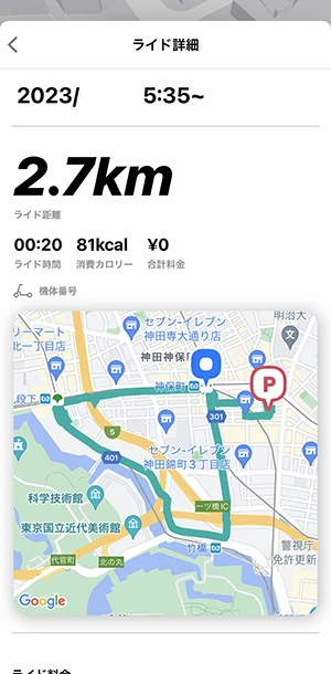 - アプリで、ライドの履歴と詳細(日時、距離、時間、消費カロリー、料金、機体番号、クーポンの有無、スタートと終了のポート)を確認。