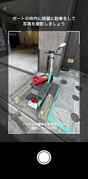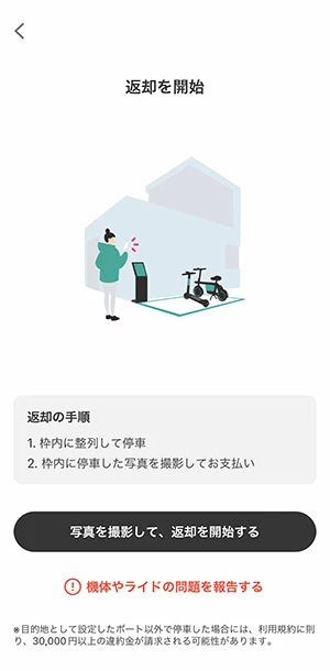 - 返却ポートの指定された枠の中に駐車し、アプリで指定される手順に従って写真を撮影。車体やポートに問題があれば報告して終了。