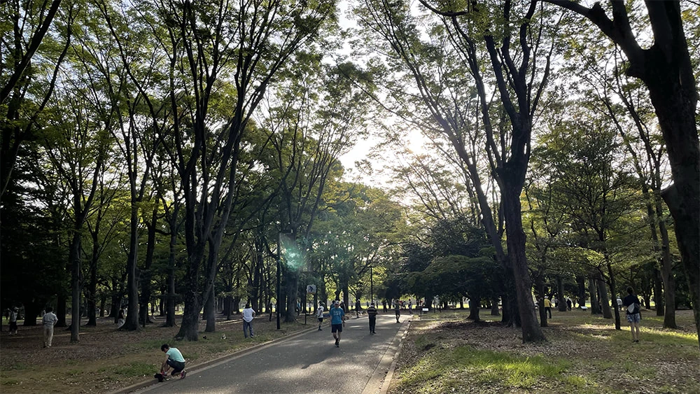 ところが、代々木公園の西側の、国立オリンピック記念青少年総合センター沿いの道路の凸凹が、さっき以上に本当に酷い。また、手が痛くなってきたので、途中でちょっと休憩。LUUPには、一時停車の機能があるので、停車して代々木公園へ。結構な人数が集まる朝のラジオ体操を横目に、園内を散策します。しかし、明治神宮へは抜けられないことを初めて知った…Googleマップ、信じてなくてすまん。