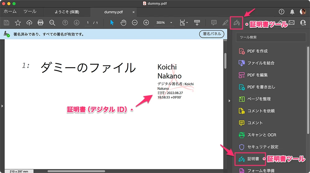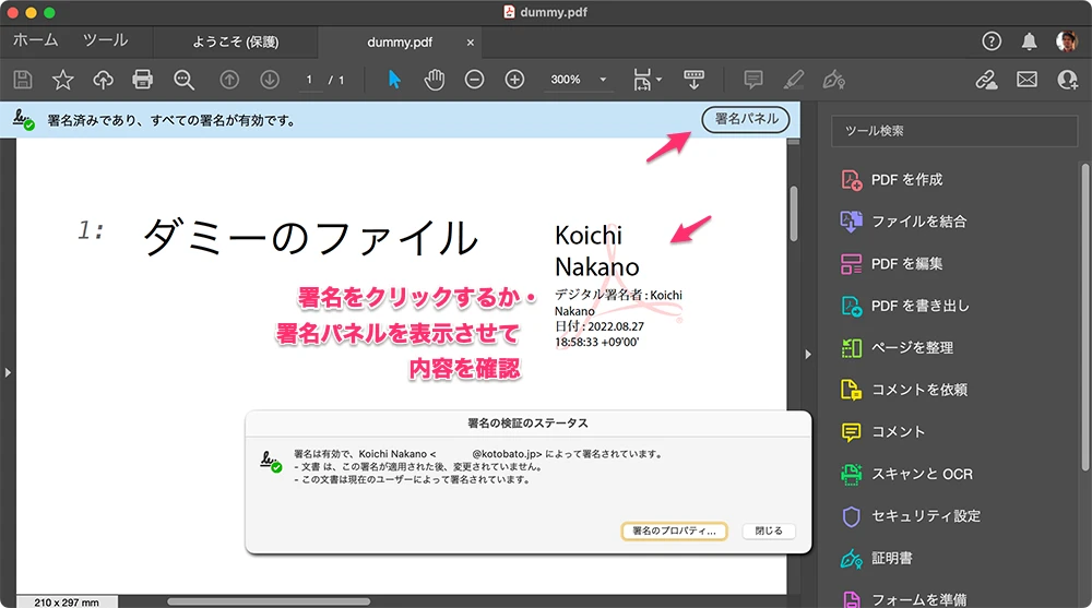- ウインドウ上部に表示されるバーで、署名が有効なことを確認する。