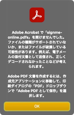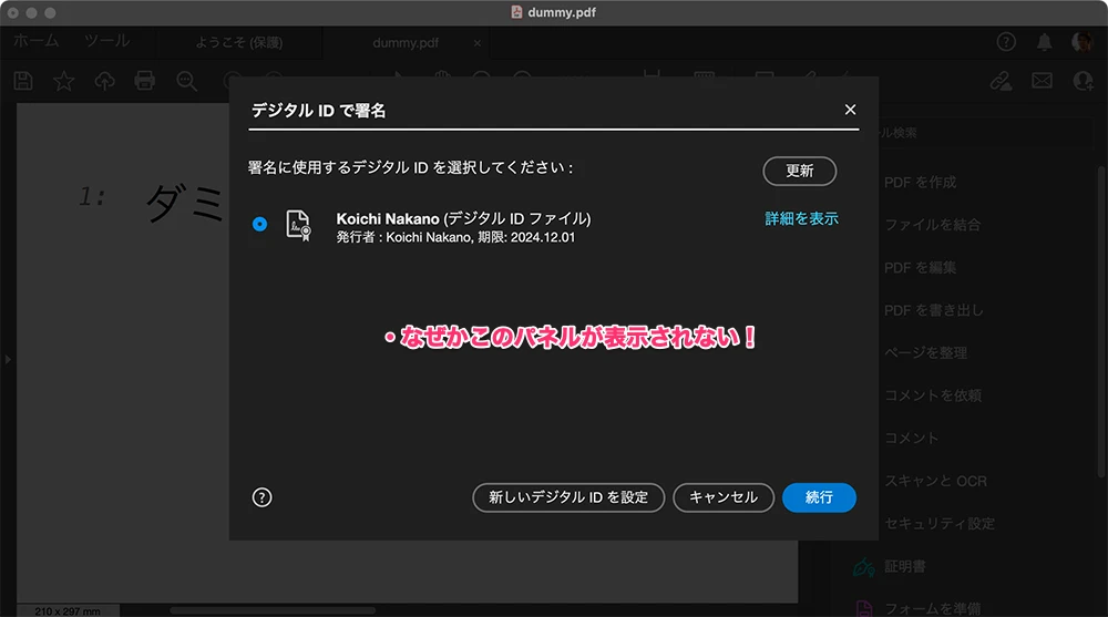 証明書の登録を一旦解除して、再設定してもダメ。再現性あり。 - 署名したいPDFファイルは、Dropboxフォルダの中にある。