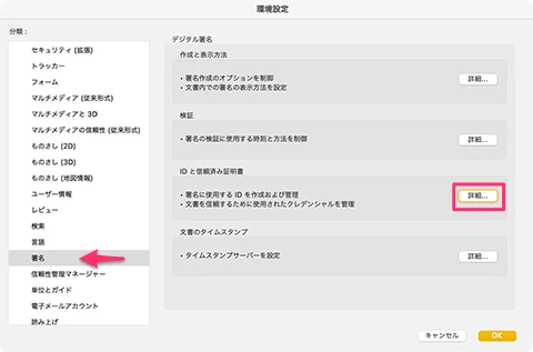 - Acrobatを再起動し、「環境設定」-「署名」-「IDと信頼済み証明書」を再設定する。[詳細…]ボタンをクリックする。