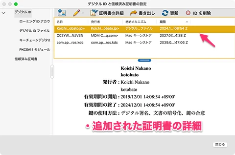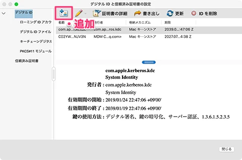 - ウインドウ左上のボタンで証明書を[追加]する。