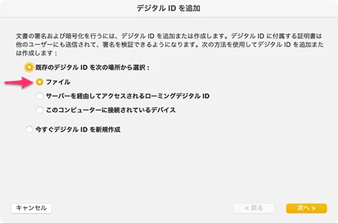 - 「既存のデジタルIDを次の場所から選択:ファイル」ラジオボタンを選んで、[次へ]ボタンをクリックする。
