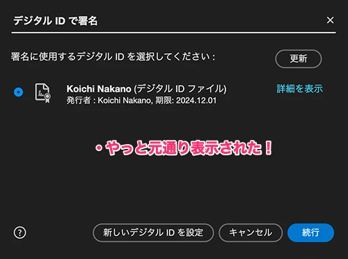 - 今度こそ、デジタルIDの選択ウインドウがオーバーレイ表示されるはず!証明書を選び、[続行]ボタンをクリックする。