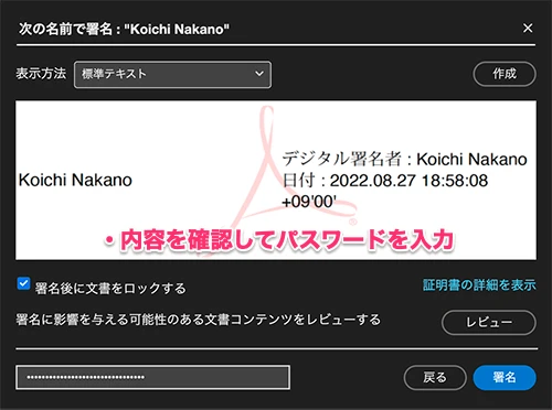 - 証明書の表示方法を設定し、パスワードを入力して[署名]ボタンをクリックする。