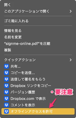 - PDFファイルを、一旦、Dropboxフォルダの外に移動させる。ファイルをオフラインでも使える状態にするには、Finderでファイルを右クリックして表示されるメニューから「オフラインアクセスを許可」を選ぶこともできるが、Dropboxの影響を確実に受けないように、一旦、外に出す。