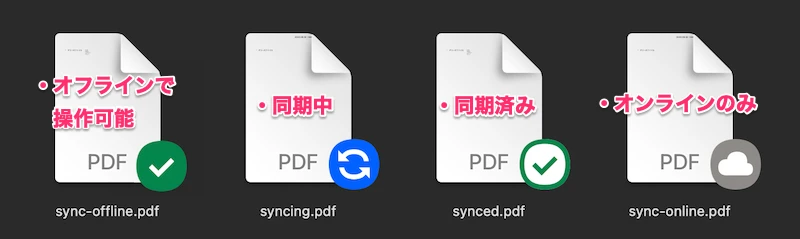- Dropboxフォルダ内のファイルやフォルダには、同期状況を示す同期アイコンが表示されるが、アップデートされないことがあるため、これもあてにしない。
