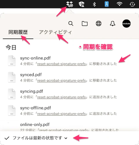 - メニューバーの同期アイコンがアニメートする。アイコンをプレスして表示される「同期履歴」「アクティビティ」で、PDFファイルの同期が確実に更新されたことを確認する。