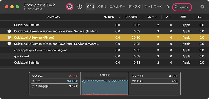 - 「quick」で検索し、Quick Look関連のアクティビティーをすべて強制終了させる。