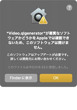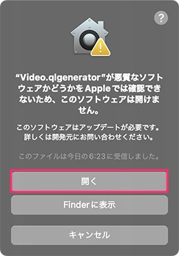 じゃあ、アプリケーションではないQuick Lookプラグインで、こんなアラートが表示された場合はどうするか?